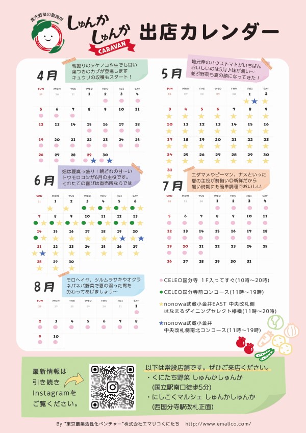 このたび、「しゅんかしゅんか」が国分寺と武蔵小金井に臨時出店いたします。